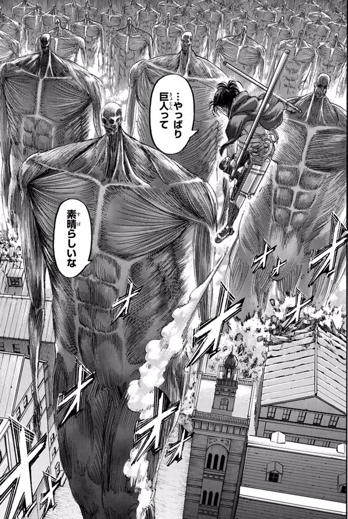 例えば進撃の巨人のこのワンシーン。漫画をAIに描かせるとして、このワンシーンに1ページ使い、このセリフと、この構図とを選ぶことができるかというと、おそらくできない(パターンとして提示してくる可能性はあるが、それはただの組み合わせの提示であって本質的に求められる価値とは異なる)。