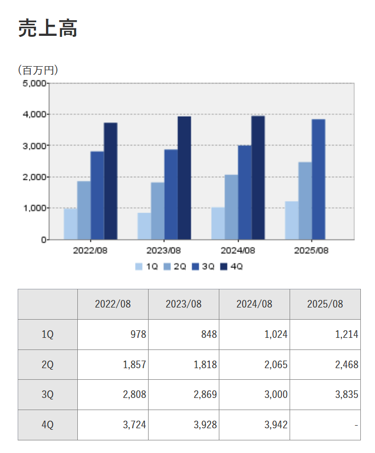 LLMによって、アプリケーションの開発難易度も工数も大幅に下がる。一方で、UIやUXはLLMが苦手な分野であり、ここに投資できるかどうかがIT事業の明暗を分けるだろう。となると、ここに強い会社としてすぐに浮かぶのがグッドパッチ社だ。過去一年、売上高は順調に推移しており、特に直近3Qは過去最高を更新し続けている。3Qにして、1年分の売上に匹敵するくらい伸びている。